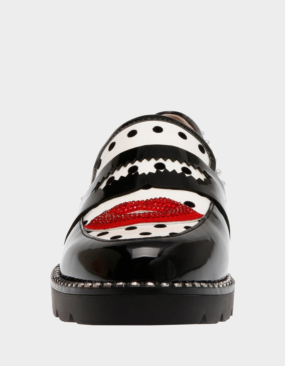 Step out in style with the DARIAN-L black & white polka dot print with a flirty red kiss embellishment! This charming pattern is great for any event. from a business meeting to a day of outdoor picnic fun with flirty flair!