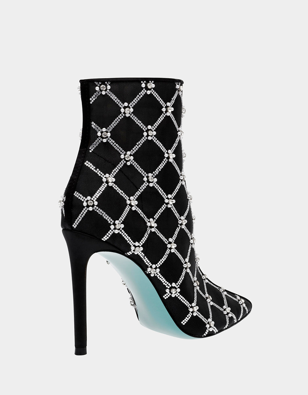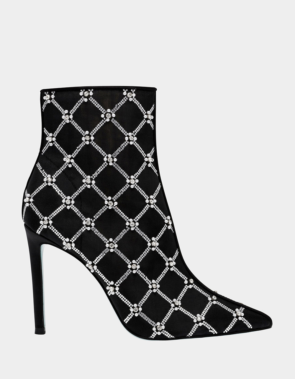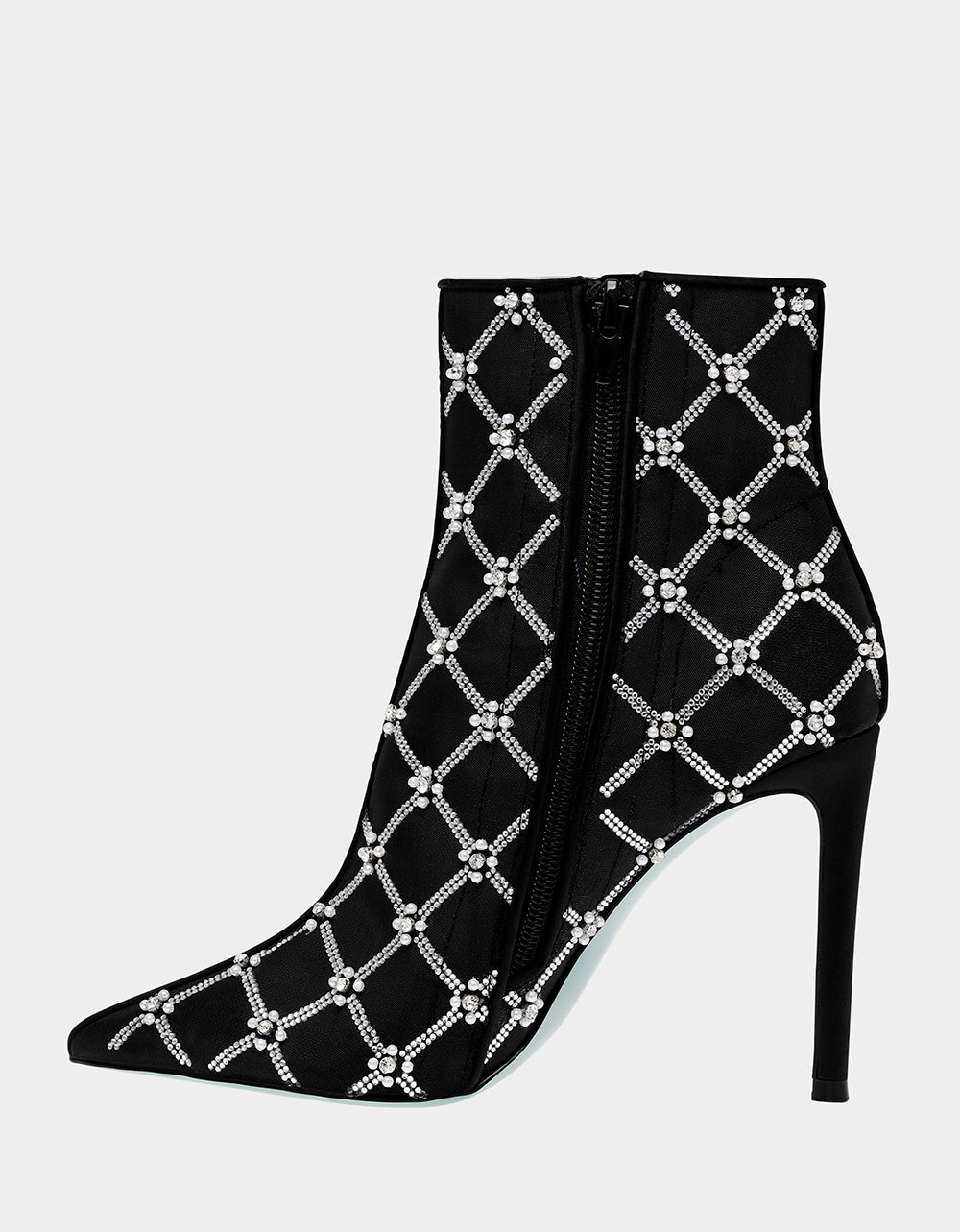 Meet LARKK. the perfect stiletto for fancy occasions. Adorned with mesh textile with hand-sewn pearl rhinestone lattice patterns. these dress booties add a touch of glamour to any outfit.