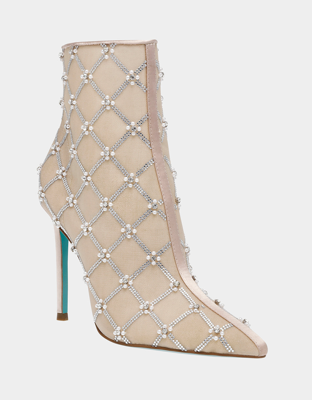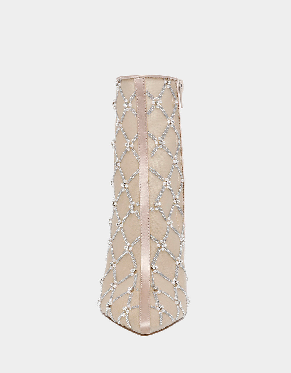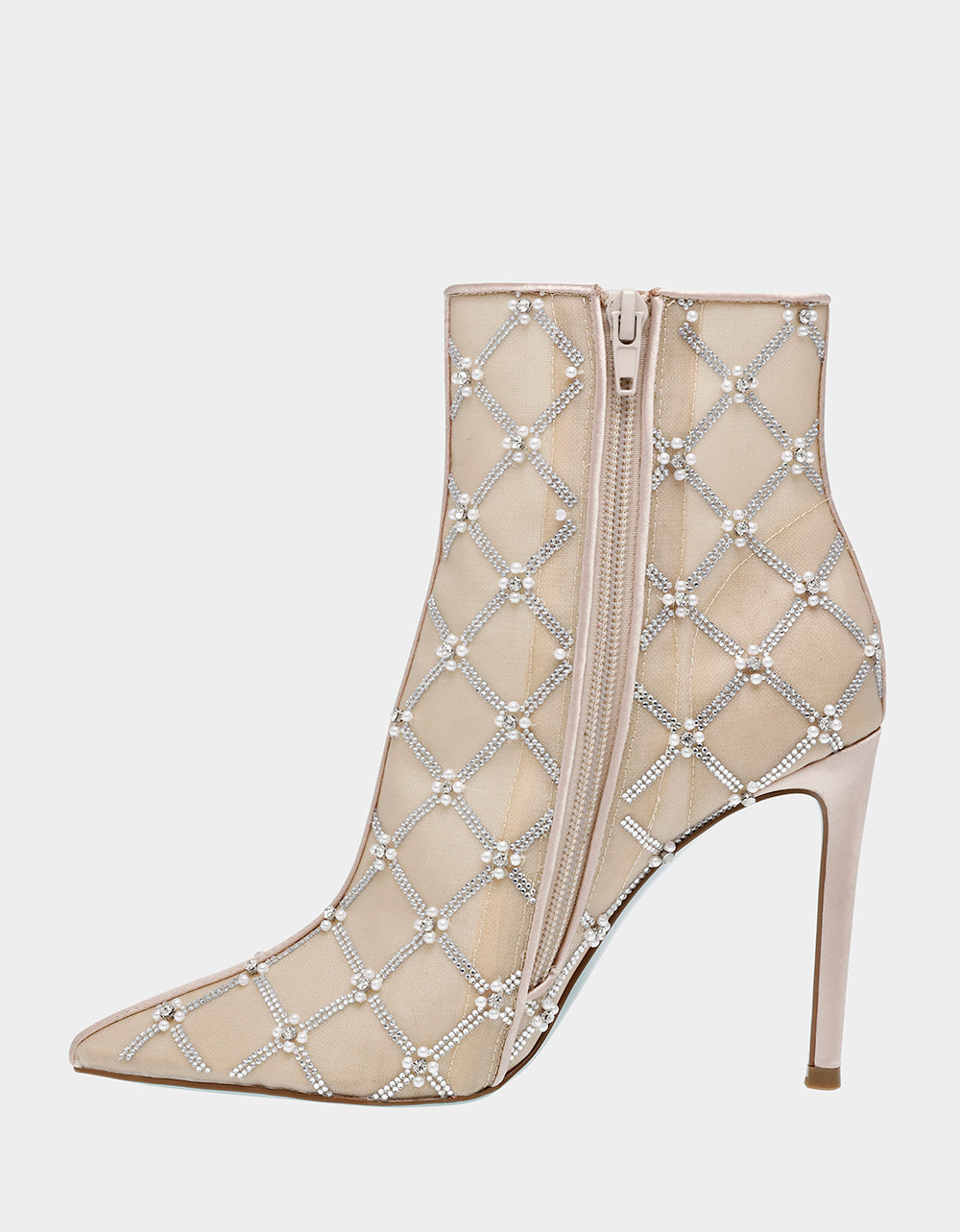 Meet LARKK. the perfect stiletto for fancy occasions. Adorned with mesh textile with hand-sewn pearl rhinestone lattice patterns. these dress booties add a touch of glamour to any outfit.
