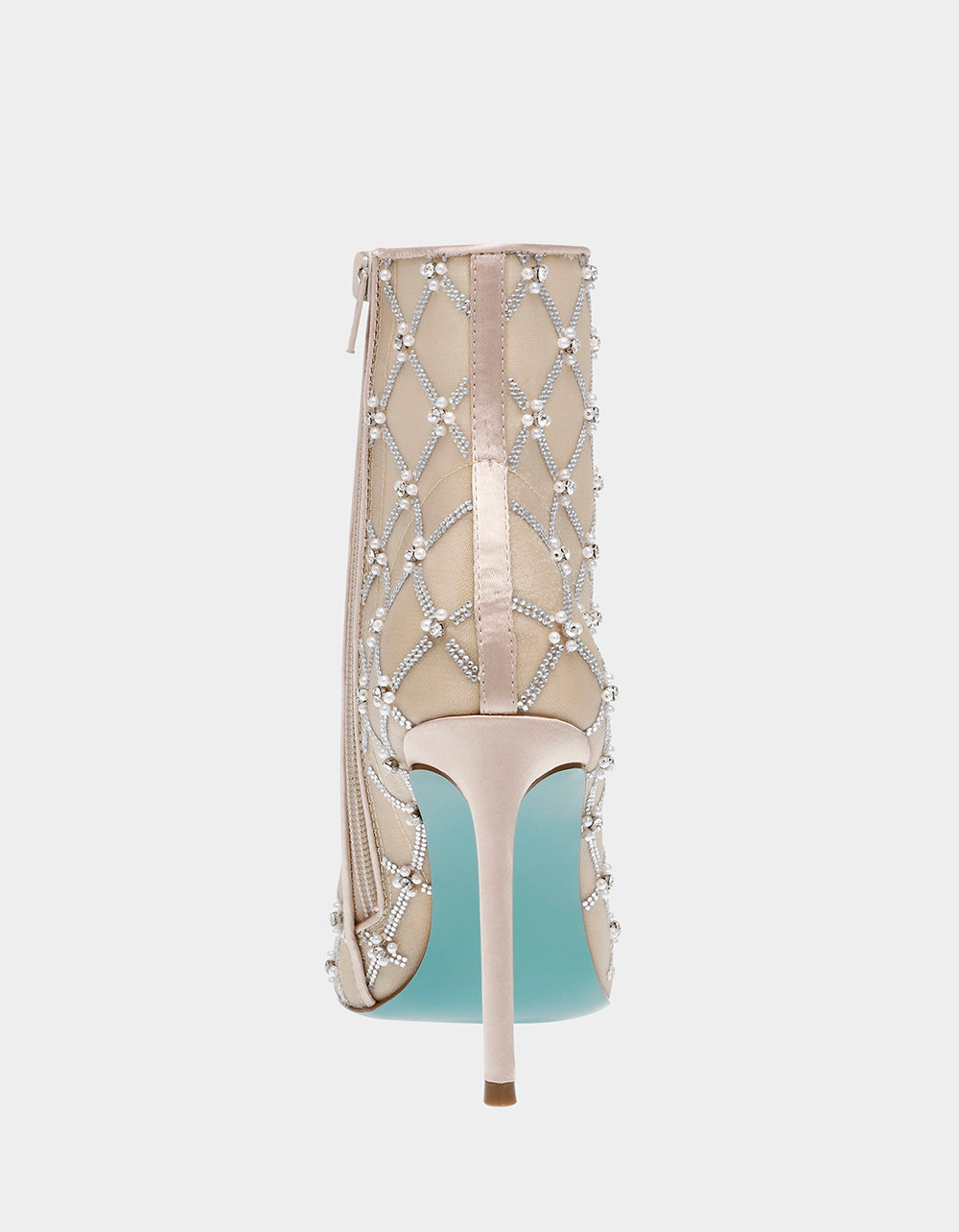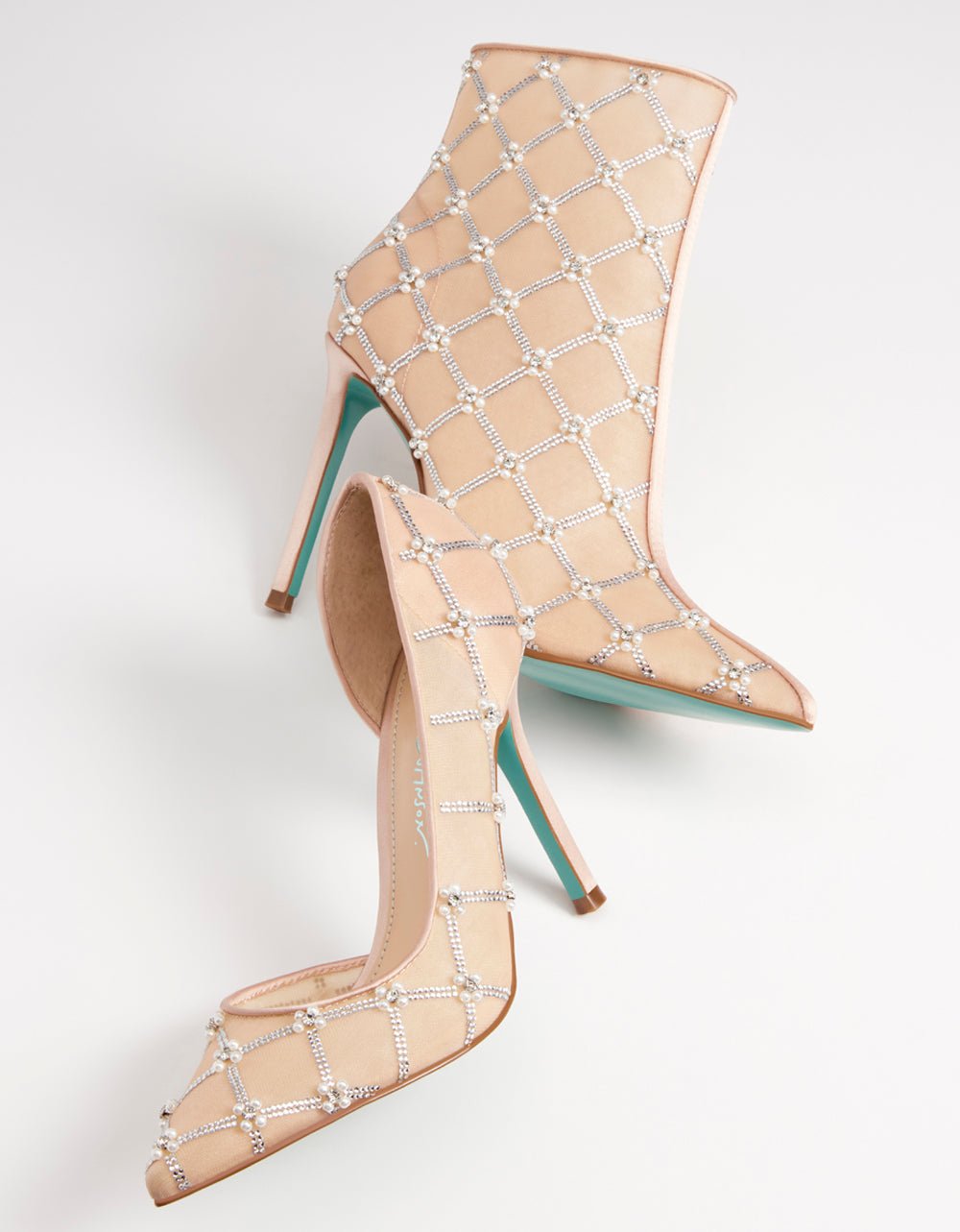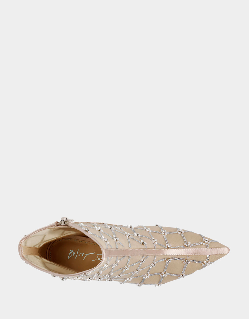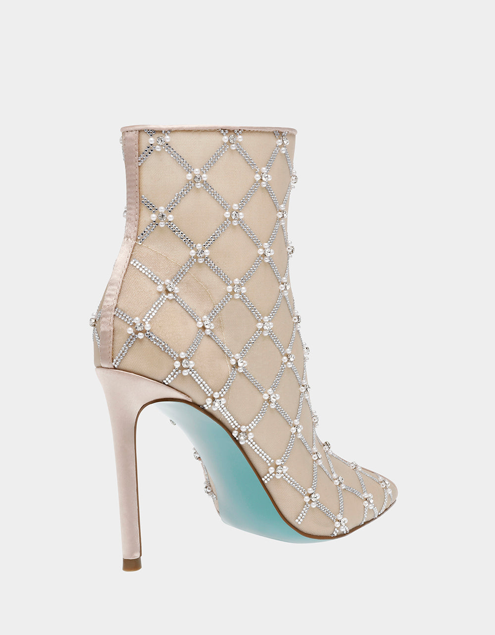 Meet LARKK. the perfect stiletto for fancy occasions. Adorned with mesh textile with hand-sewn pearl rhinestone lattice patterns. these dress booties add a touch of glamour to any outfit.